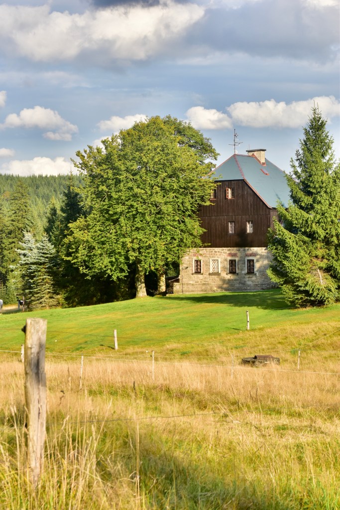 V osadě jsme se zastavily v Panském domě na jídlo a zahřát se, protože i když byl začátek září, tak v Jizerách už byla příšerná kosa, navíc osada je pověstná tím, že v zimě tam je extrémní počasí a teploty v noci často klesnou i na -30°C, takže ani tři vrstvy oblečení nám skoro nestačily a potom jsme pokračovali dál po silnici k rašeliništi.