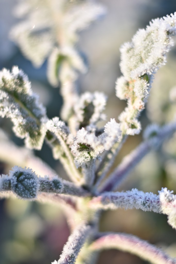 Začátek ledna přinesl slunečná mrazivá rána a já si tak přivstala abych vytáhla foťák a zachytila tu nádheru. Na záhoně mám pořád brokolici a ta je zmrzlá úplně nádherná.